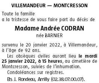 Cet espace « condoléances » est dédié à la mémoire de Madame Andrée CODRAN née BARNIER.
