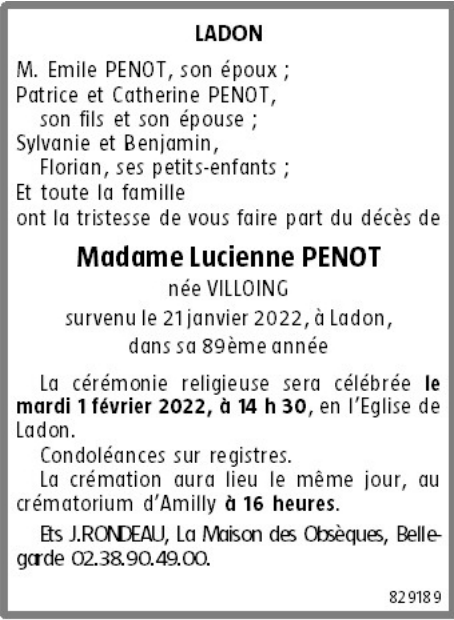 de Madame Lucienne PENOT née VILLOING