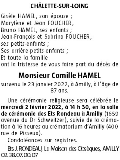 Cet espace « condoléances » est dédié à la mémoire de Monsieur Camille HAMEL.