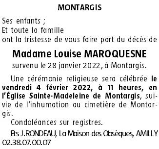 Cet espace « condoléances » est dédié à la mémoire de Madame Louise MAROQUESNE née RAGU.