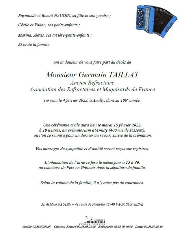 Cet espace « condoléances » est dédié à la mémoire de Monsieur Germain TAILLAT.