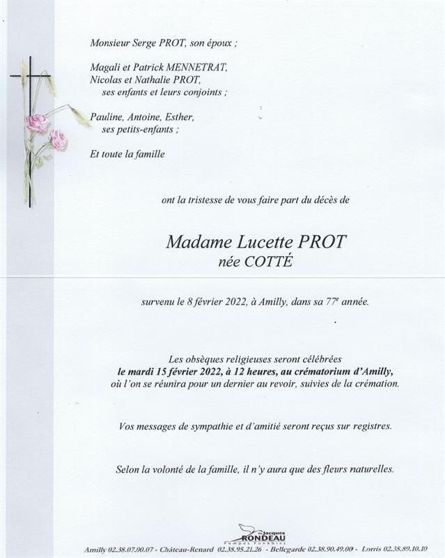 Cet espace « condoléances » est dédié à la mémoire de Madame Lucette PROT née COTTÉ.