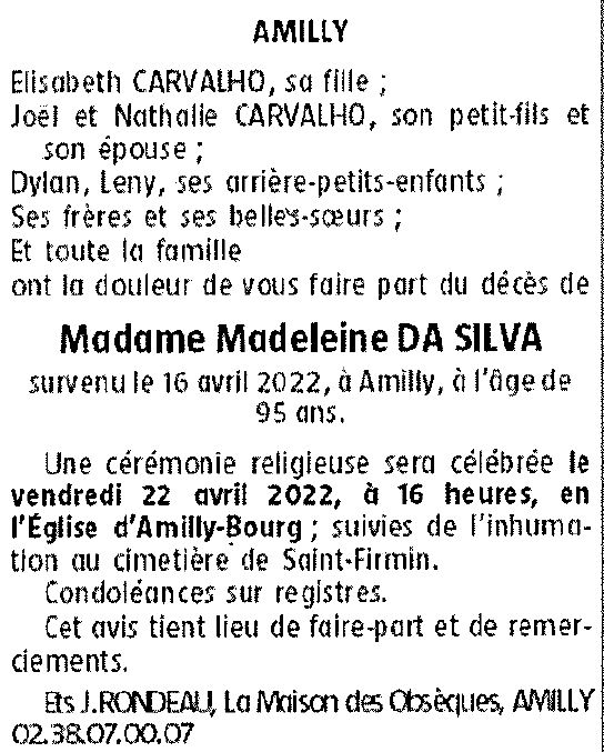 Cet espace « condoléances » est dédié à la mémoire de Madame Madalena DA SILVA CARVALHO née ALVES DOS SANTOS.