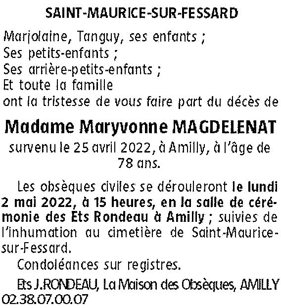 Cet espace « condoléances » est dédié à la mémoire de Madame Maryvonne MAGDELENAT née HOUX.