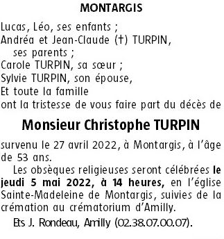 Cet espace « condoléances » est dédié à la mémoire de Monsieur Christophe TURPIN.