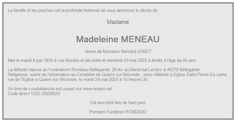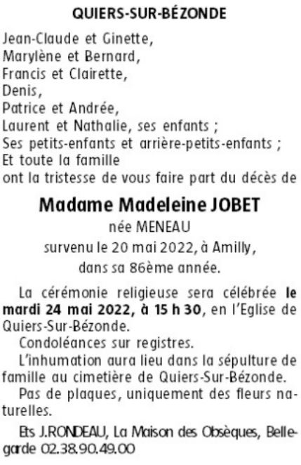 de Madame Madeleine JOBET née MENEAU