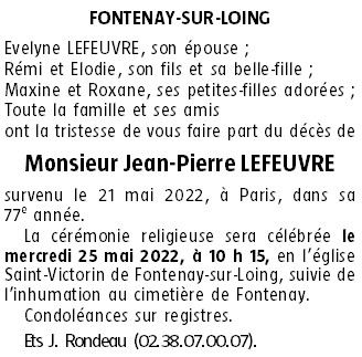 Cet espace « condoléances » est dédié à la mémoire de Monsieur Jean-Pierre LEFEUVRE.