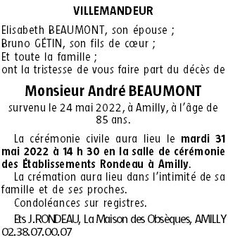 Cet espace « condoléances » est dédié à la mémoire de Monsieur André BEAUMONT.