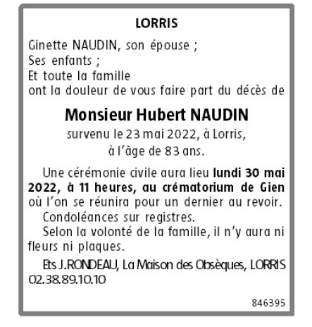 Décédé à Lorris (45260) le lundi 23 mai 2022