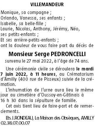 Cet espace « condoléances » est dédié à la mémoire de Monsieur Serge PEDRONCELLI.