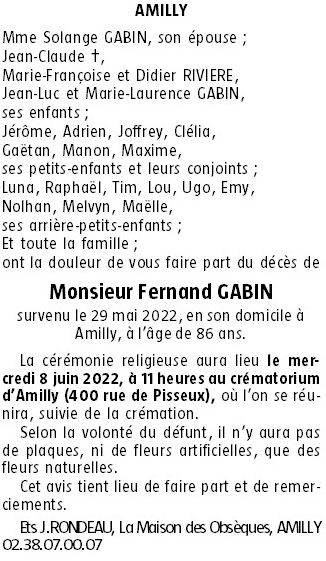 Cet espace « condoléances » est dédié à la mémoire de Monsieur Fernand GABIN.