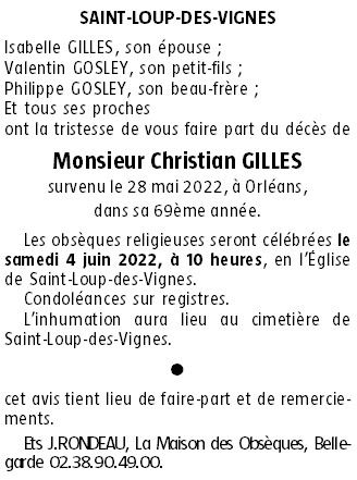 Cet espace « condoléances » est dédié à la mémoire de Monsieur Christian GILLES.