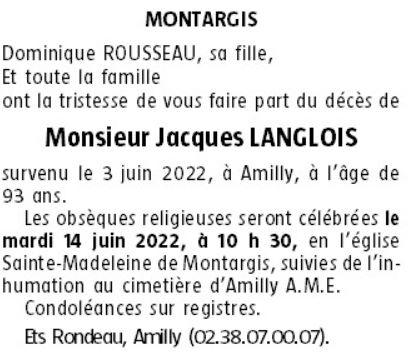 Cet espace « condoléances » est dédié à la mémoire de Monsieur Jacques LANGLOIS.