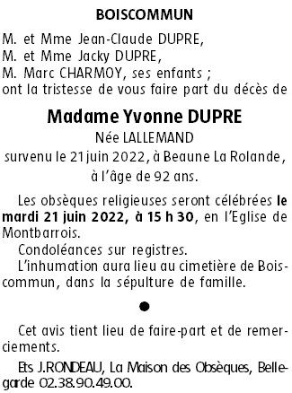 de Madame Yvonne DUPRÉ née LALLEMAND