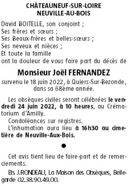 Cet espace « condoléances » est dédié à la mémoire de Monsieur Joël FERNANDEZ.