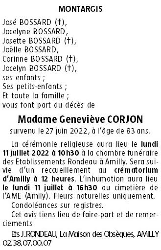 Cet espace « condoléances » est dédié à la mémoire de Madame Geneviève CORJON.