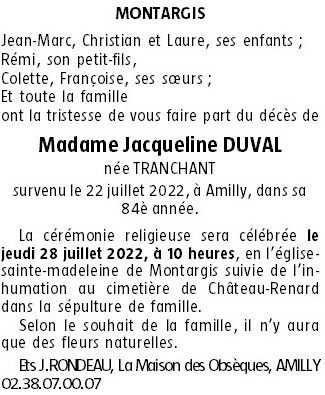 de Madame Jacqueline DUVAL née TRANCHANT