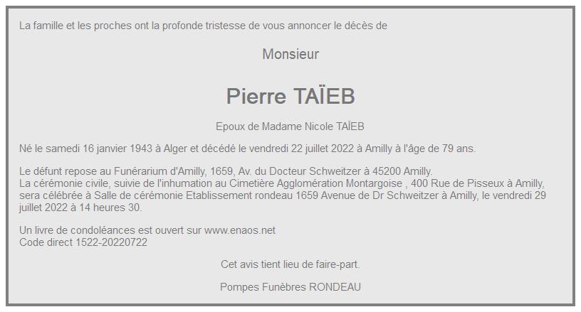 Cet espace « condoléances » est dédié à la mémoire de Monsieur Pierre TAÏEB.