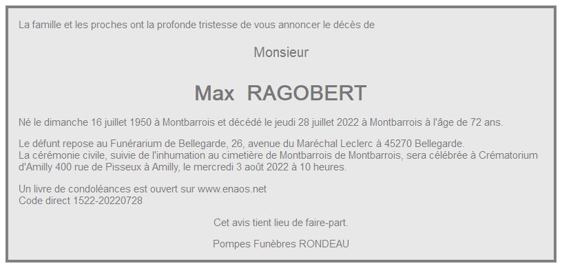 Cet espace « condoléances » est dédié à la mémoire de Monsieur Max RAGOBERT.