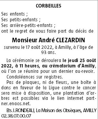 Cet espace « condoléances » est dédié à la mémoire de Monsieur André CLEZARDIN.