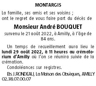 Cet espace « condoléances » est dédié à la mémoire de Monsieur André BOUQUET.