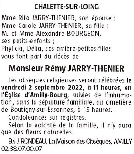 Cet espace « condoléances » est dédié à la mémoire de Monsieur Rémy JARRY-THENIER.