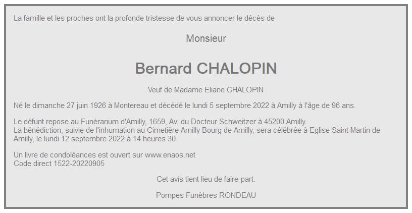 Cet espace « condoléances » est dédié à la mémoire de Monsieur Bernard CHALOPIN.