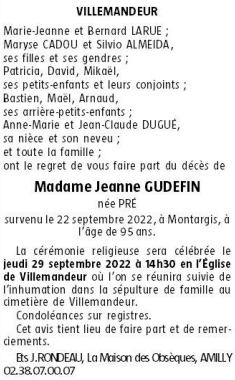 Cet espace « condoléances » est dédié à la mémoire de Madame Jeanne GUDEFIN née PRÉ.