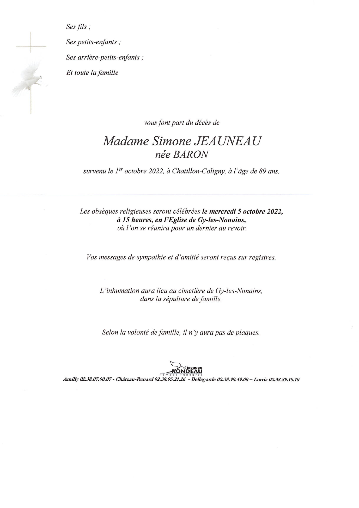 de Madame Simone JEAUNEAU née BARON