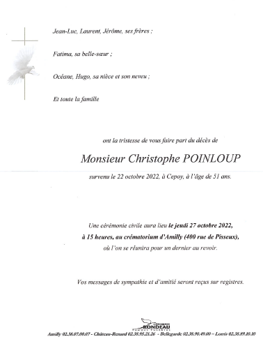Cet espace « condoléances » est dédié à la mémoire de Monsieur Christophe POINLOUP.