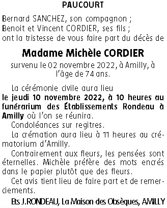 Cet espace « condoléances » est dédié à la mémoire de Madame Michèle CORDIER.