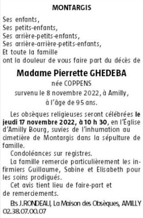 de Madame Pierrette GHEDEBA née COPPENS
