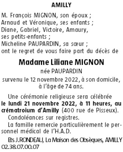 Cet espace « condoléances » est dédié à la mémoire de Madame Liliane MIGNON née PAUPARDIN.