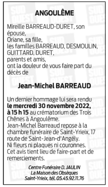 Cet espace « condoléances » est dédié à la mémoire de Monsieur Jean-Michel BARREAUD.