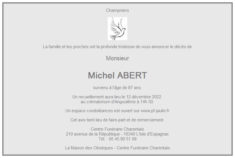 Cet espace « condoléances » est dédié à la mémoire de Monsieur Michel ABERT.