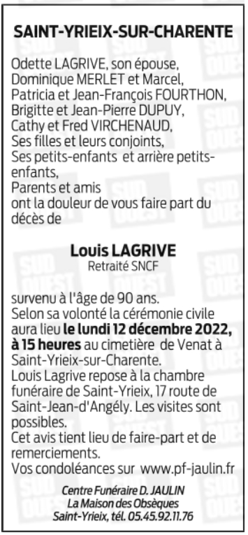 Cet espace « condoléances » est dédié à la mémoire de Monsieur Louis LAGRIVE.