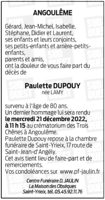 Cet espace « condoléances » est dédié à la mémoire de Madame Paulette DUPOUY née LAMY.