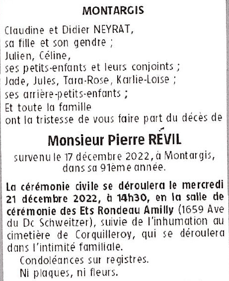 Cet espace « condoléances » est dédié à la mémoire de Monsieur Pierre RÉVIL.