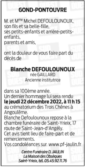 Cet espace « condoléances » est dédié à la mémoire de Madame Antoinette DEFOULOUNOUX née GAILLARD.