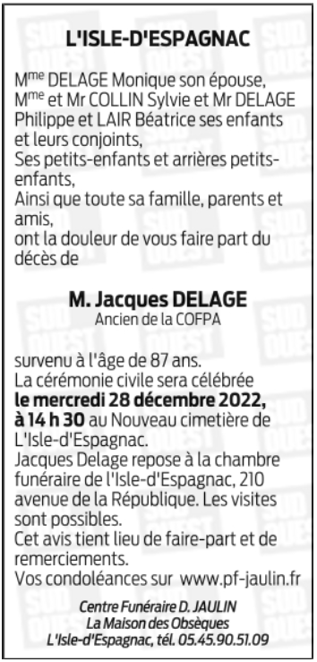 Cet espace « condoléances » est dédié à la mémoire de Monsieur JACQUES DELAGE.