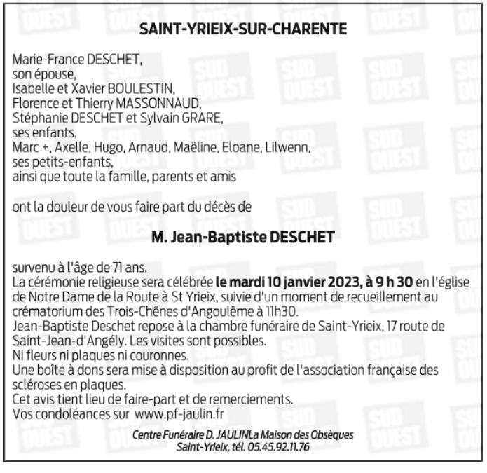 Cet espace « condoléances » est dédié à la mémoire de Monsieur JEAN-BAPTISTE DESCHET.