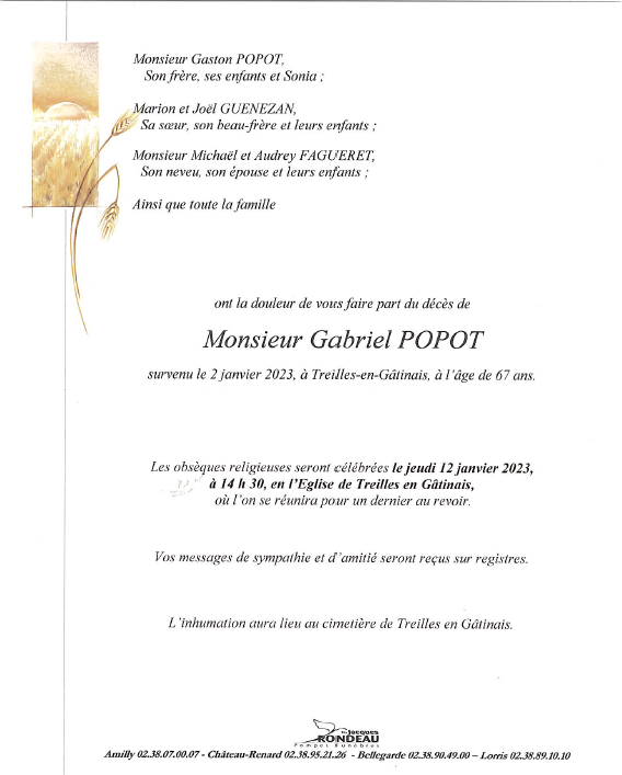 Cet espace « condoléances » est dédié à la mémoire de Monsieur Gabriel POPOT.