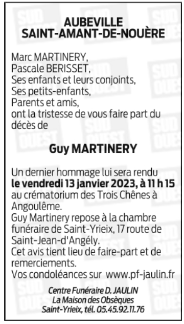 Cet espace « condoléances » est dédié à la mémoire de Monsieur Guy MARTINERY.