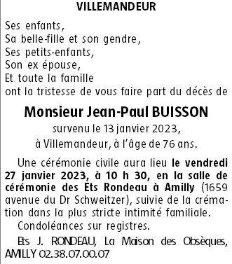 Cet espace « condoléances » est dédié à la mémoire de Monsieur Jean-Paul BUISSON.