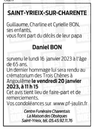 Décédé à Soyaux (16800) le lundi 16 janvier 2023