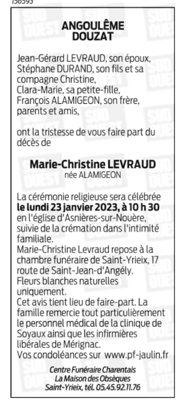 de Madame Marie-Christine LEVRAUD née ALAMIGEON