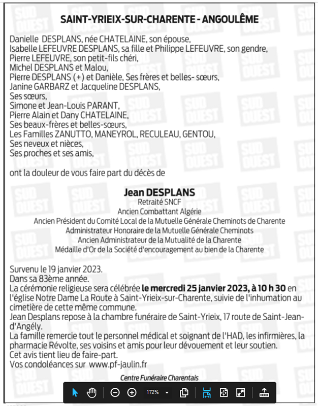 Cet espace « condoléances » est dédié à la mémoire de Monsieur Jean DESPLANS.
