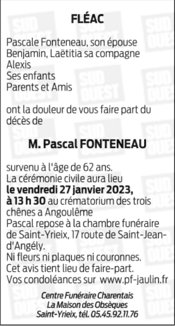 Cet espace « condoléances » est dédié à la mémoire de Monsieur Pascal FONTENEAU.