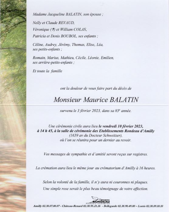 Cet espace « condoléances » est dédié à la mémoire de Monsieur Maurice BALATIN.
