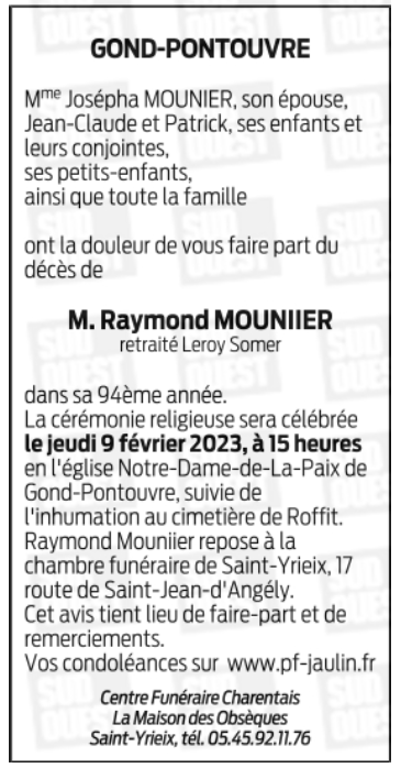 Cet espace « condoléances » est dédié à la mémoire de Monsieur Raymond MOUNIER.